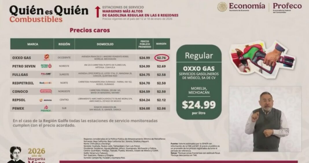 Durante la presentación del reporte, también se dio a conocer el “Quién es Quién” en el precio de la gasolina regular, donde se indicó que el precio promedio nacional se ubicó en 23.57 pesos por litro.