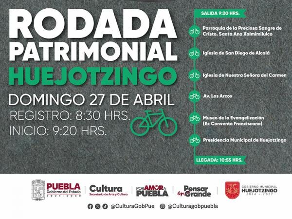 Las siguientes rodadas y detalles logísticos se publicarán en las redes sociales oficiales de la Secretaría de Arte y Cultura: Facebook “Secretaría de Cultura Puebla”, X “@CulturaGobPue” e Instagram “@Culturagobpuebla”.
