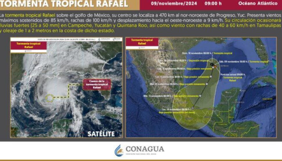 De acuerdo con el informe más reciente del SMN, Rafael ha disminuido la fuerza de sus vientos a medida que se desplaza por el Golfo, y se encuentra aproximadamente a 470 kilómetros al nor-noroeste de Progreso, Yucatán, a las 09:00 horas de este sábado. Los vientos máximos registrados son de 85 km/h, con rachas de hasta 100 km/h, y el ciclón se desplaza hacia el oeste-noroeste a una velocidad de 9 km/h.