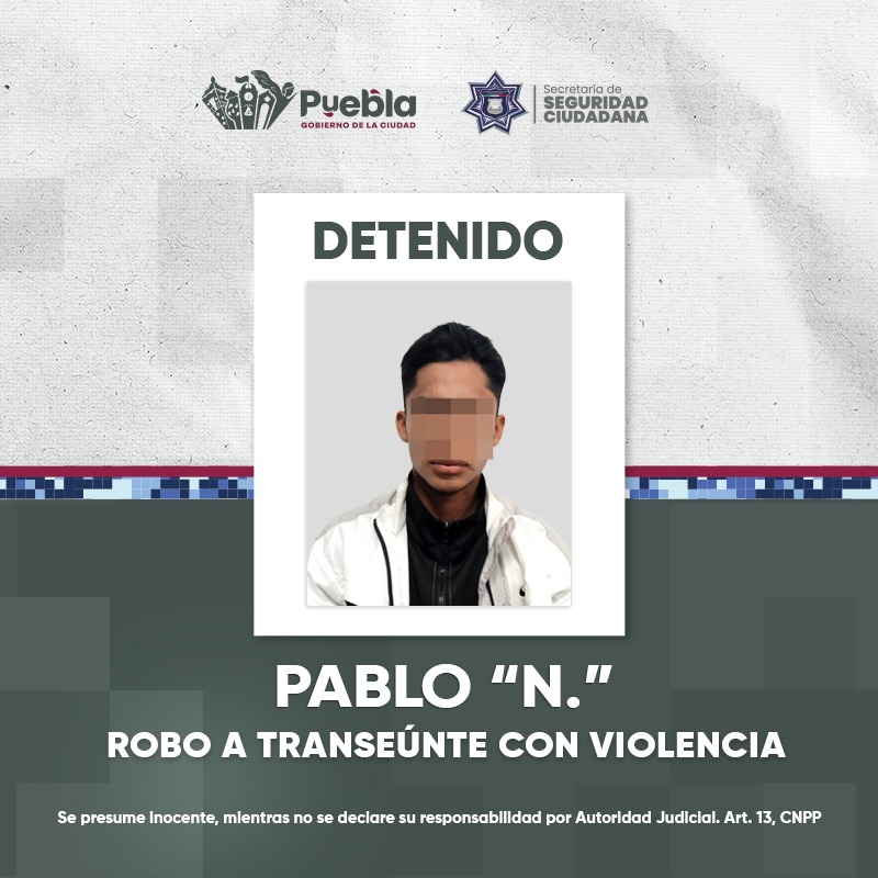 Derivado del despliegue territorial implementado en la zona sur de la capital, Policías de la Ciudad detuvieron a Pablo “N.”, de 18 años de edad, quien cuenta con registros por delitos de robo a comercio.