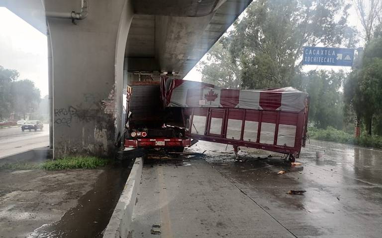 El conductor del camión de carga perdió el control debido a las condiciones del pavimento, que se encontraba mojado por las lluvias registradas en la zona. Como resultado, la caja del tráiler de color rojo quedó en una posición diagonal, bloqueando uno de los carriles de la vialidad y provocando tráfico lento en el área.