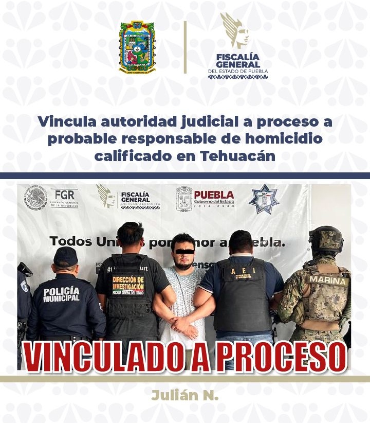 La Fiscalía General del Estado de Puebla obtuvo la vinculación a proceso de Julián N., de 31 años, por su probable responsabilidad en el delito de homicidio calificado ocurrido en el municipio de Tehuacán.